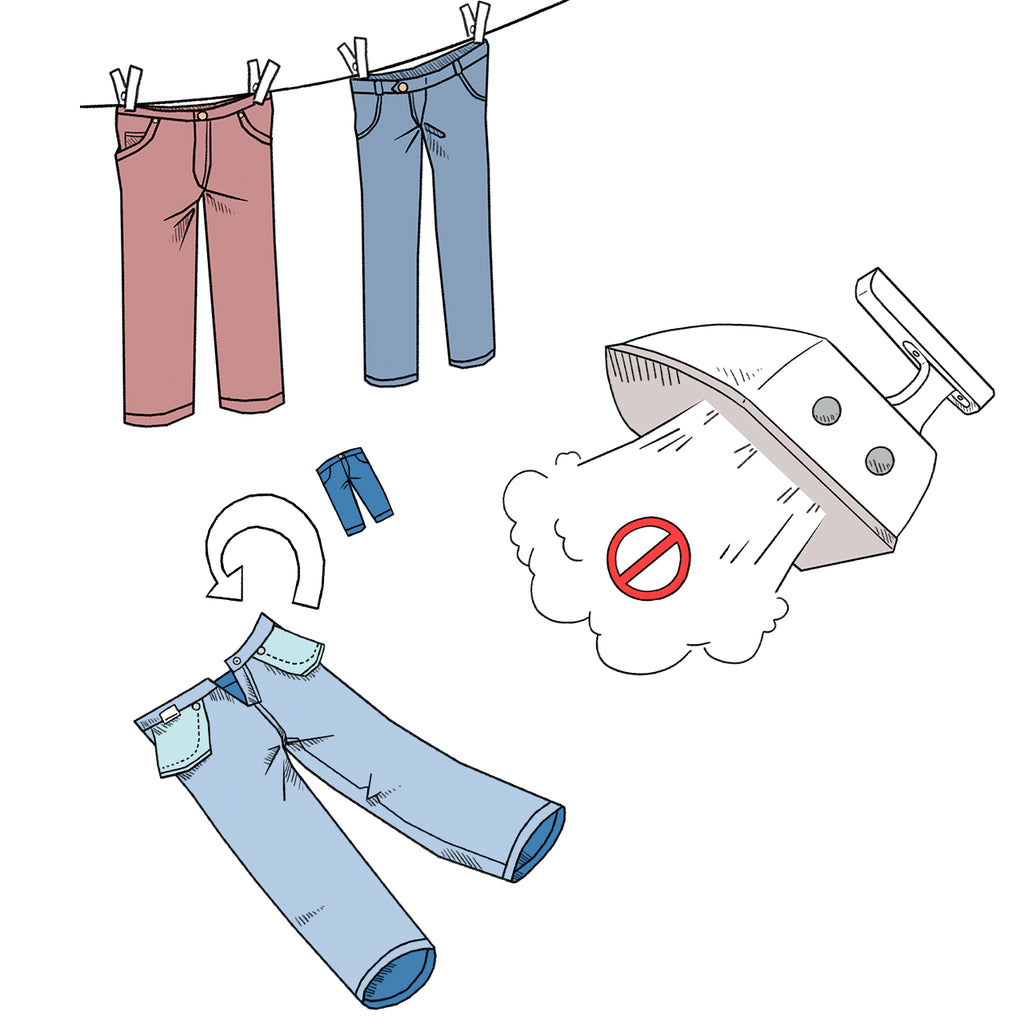 We recommend smoothing down the trousers by hand and hanging them up to drip-dry.