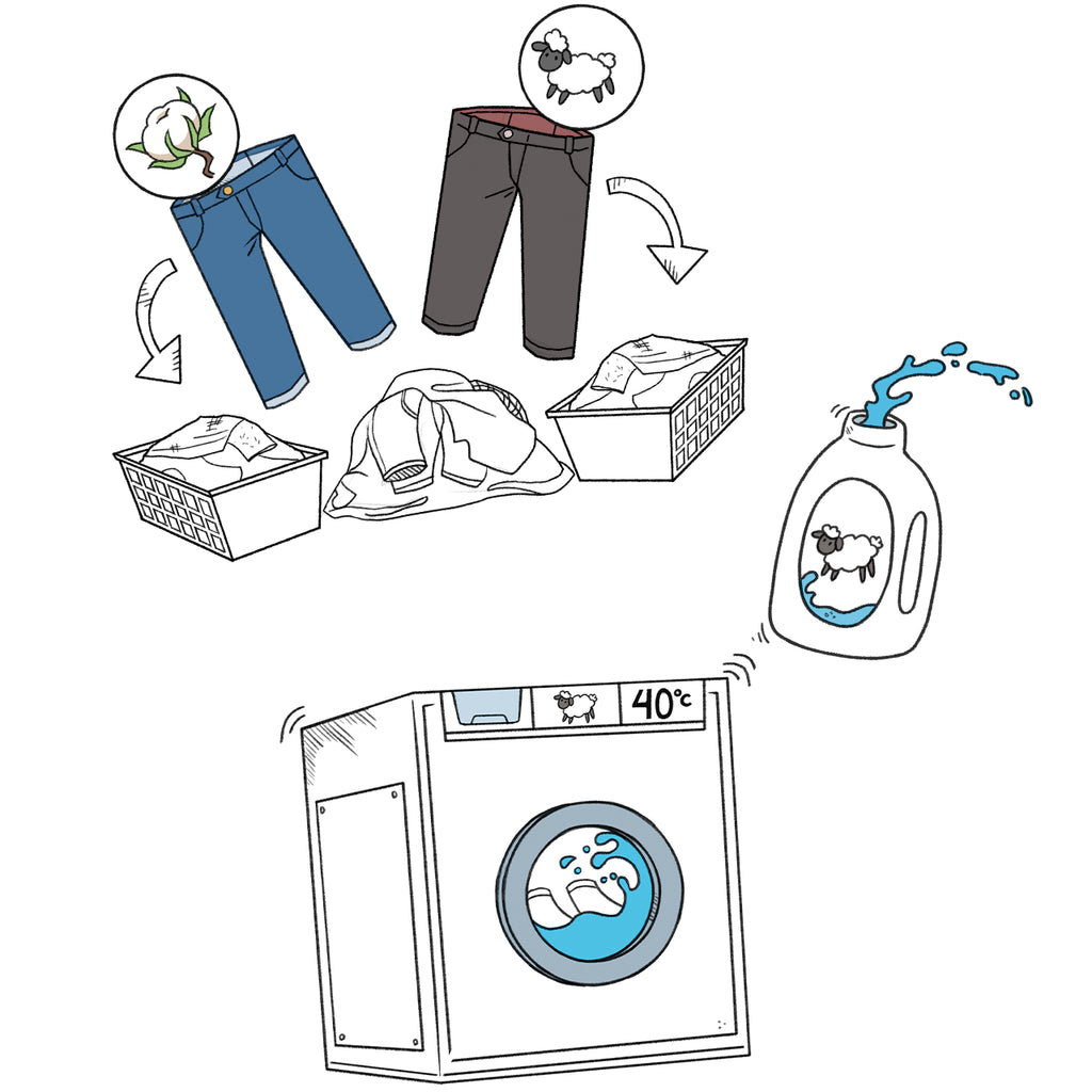 Fasten all the buttons and zips before washing in order to prevent friction or snag-ging on the trouser fabric.