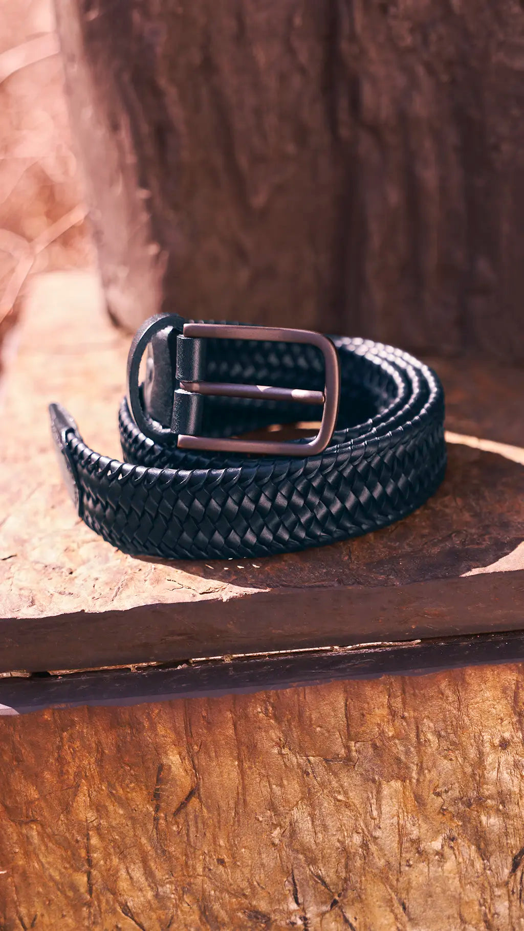 Lay the belt down flat, as shown. Measure from the start of the leather at the buckle to the third hole. This gives you your belt size.